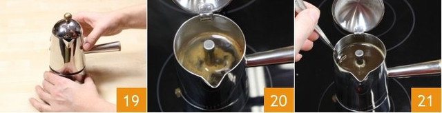 Туго закрутіть кавоварку, щоб під час кипіння кава не просочувалася в нижній частині кавоварки. Варімо каву на слабкому вогні. Радимо вам не давати кави занадто довго булькати, це зберегти солодкість і аромат напою. Наша кава готова: перемішайте її перед використанням безпосередньо в моко, щоб зробити каву одноріднішою.